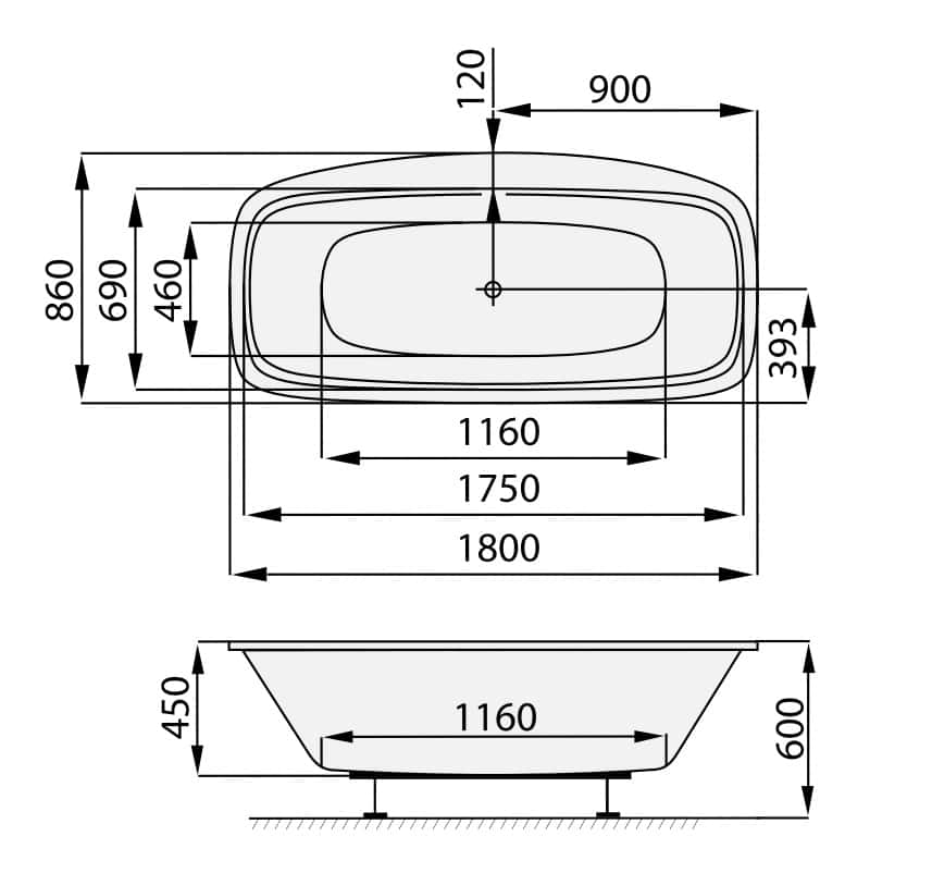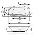 - vana obdélníková se zaoblenými rohy a ostrůvkem 1800×860 mm