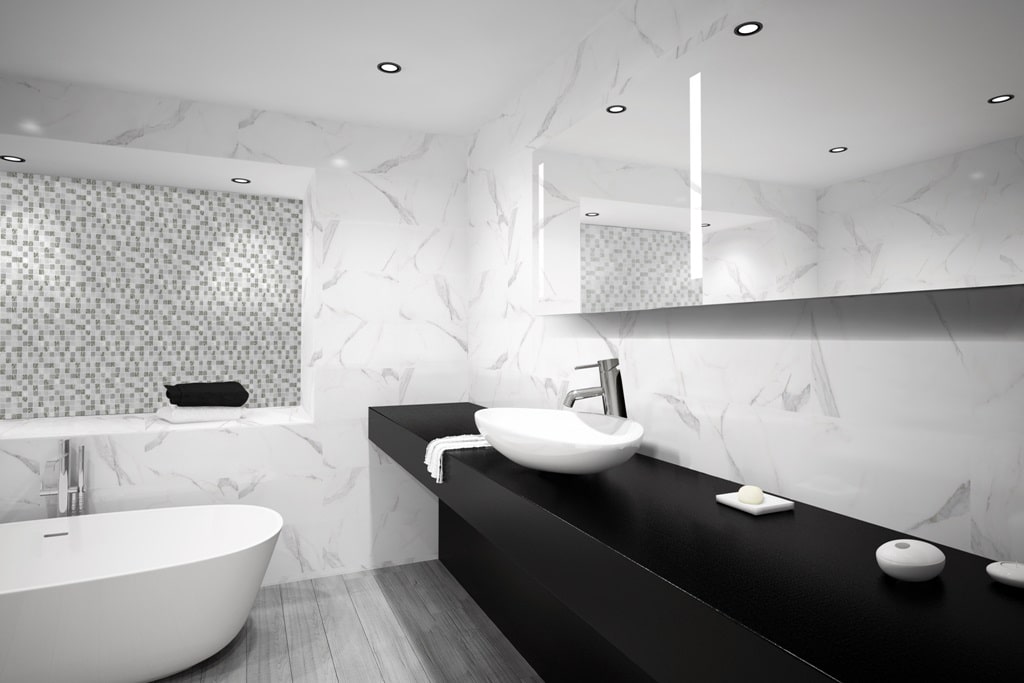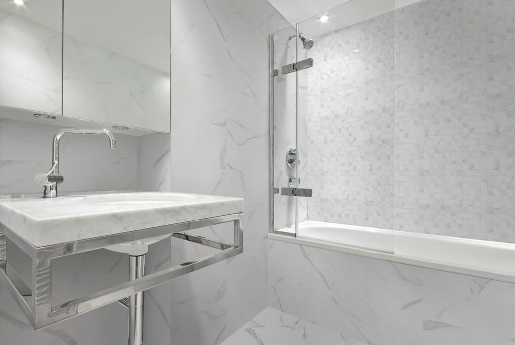 Dlažba je ve skutečnosti bílá s mramorováním.